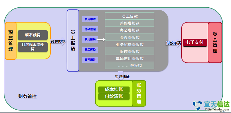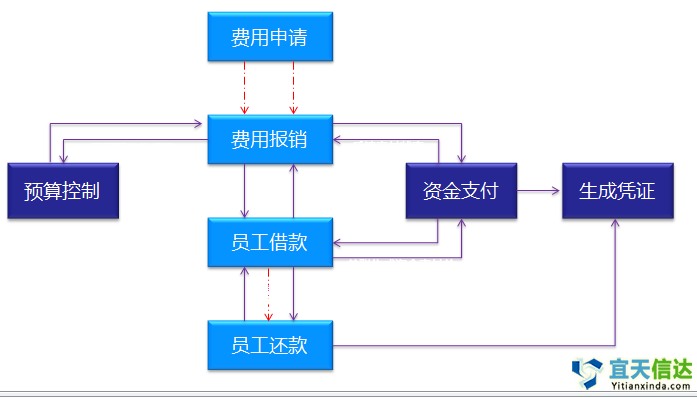 員工報銷其與預算管理模塊、資金管理模塊、賬務模塊無縫銜接。通過預算控制方案進行成本預算和現金流預算控制;對無需付款業務可以直接生成財務憑證;對于需進行付款的報銷業務,直接發起電子支付申請,付款后自動生成記賬憑證,提高核算和支付效率。
