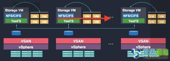 VNAS是運(yùn)行在VMware虛擬中的一種NAS虛擬化服務(wù),它的部署非常簡(jiǎn)單,利用VSAN虛擬出來(lái)的硬盤(pán),通過(guò)VMware的vSphere一鍵操作即可完成部署。其核心是達(dá)沃自主研發(fā)的分布式文件系統(tǒng)YeeFS,對(duì)外提供標(biāo)準(zhǔn)的NFS/CIFS接口,以及集群式NAS服務(wù)。由于它與VSAN運(yùn)行在同一個(gè)宿主機(jī)上,即使VMs遷移了,還是可以實(shí)現(xiàn)對(duì)StorgeVM的就近訪問(wèn),與VMs位置無(wú)關(guān)。另外,通過(guò)創(chuàng)新數(shù)據(jù)調(diào)度等技術(shù),VNAS提供全活集群的保障機(jī)制,因此當(dāng)本地StorgeVM故障時(shí),VMs仍可以通過(guò)其他Host上的StorgeVM繼續(xù)訪問(wèn)相關(guān)數(shù)據(jù)。當(dāng)然,VNAS對(duì)故障的判斷,需要VSAN提供相應(yīng)的物理資源信息。